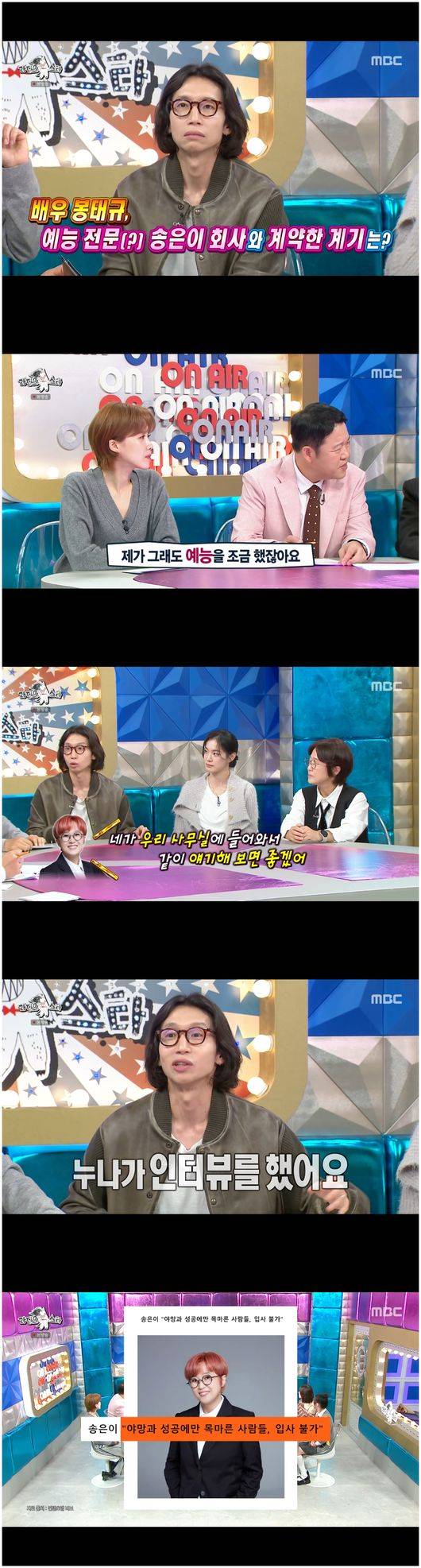 봉태규는 “내가 송은이랑 계약을 한 건 욕망이 있었다. 송은이가 보여준 시너지가 있다. 잘 될 것 같았다. 뭔지 알지 않냐”라며 “그런데 계약하고 얼마 안 되고, 다른 배우에 대해 인터뷰를 하는데 ‘우리 사무실을 선택하는 연예인 중 유명해지고 싶어서 계약하는 사람은 없다’라고 하더라”라면서 송은이의 인터뷰에 당황스러움을 느꼈다고 말했다.