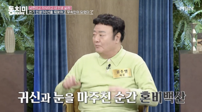 지난 해에는 MBN '속풀이쇼 동치미'에 출연, “연기 인생 50년을 뒤로 하고 무속인이 되었다”고 고백해 눈길을 끌었다. 당시 방송에서 김주영은 “집사람과 아들과 의논을 했다. 아들이 죽는 것보다 낫지 않아? 해서 일단 살고 봐야지. 그래서 신을 모시게 됐다”고 고백하자 선우은숙은 “연기는 안 하냐”고 질문했고 김주영은 “연기는 죽을 때까지 하고 싶다”고 말했다.