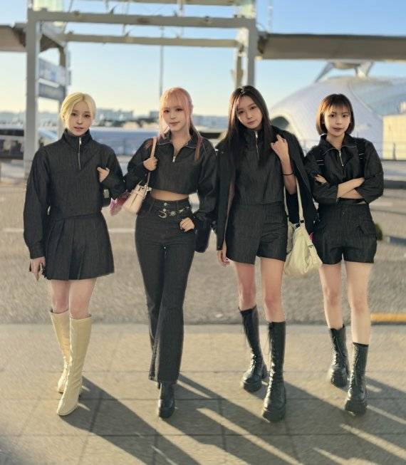 공항 출국 사진 속 위나는 왼쪽부터 원이, 도아, 은아, 연서 순으로 서 있으며, 통일감 있는 스타일링으로 눈길을 끌었다.