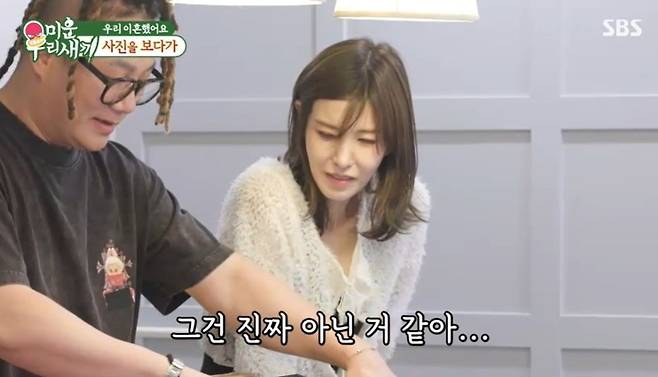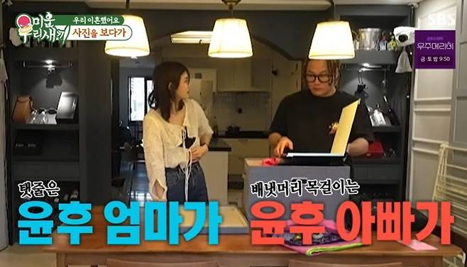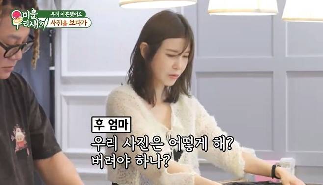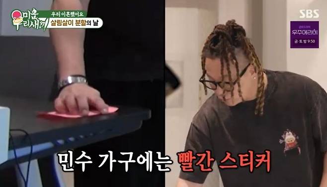 김민지는 거의 모든 주방 가전제품을 가져가라고 하며 "엄마가 이미 사주셨다"라고 말했다. 이에 윤민수는 "엄마 괜찮아?"라고 말하며 빨간 포스트잇을 붙였다. 이어 수납장 안 한 상자엔 결혼사진이 들어 있었다. 윤민수가 "다시 넣을게"라고 하자 김민지는 "빨리 넣어"라고 말하면서 "우리 사진은 버려야 하나? 어떻게 하지?"라고 고민했다.