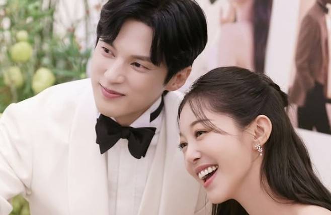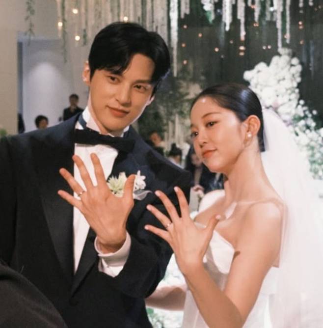 공개된 사진엔 김가은과 윤선우의 결혼식 풍경이 담겼다. 사진 속 이들은 각각 순백의 웨딩드레스와 턱시도를 차려입고 선남선녀 부부의 자태를 뽐냈다.