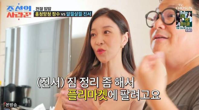 원진서는 "그래도 안 쓰니까 빨리 팔자"라며 "그래야 짐 놓을 공간이 나온다"라고 설득했다. 스튜디오에서 지켜보던 최성국 역시 "살림을 합치려면 짐을 많이 비워야 한다"라고 원진서의 말에 공감했다.