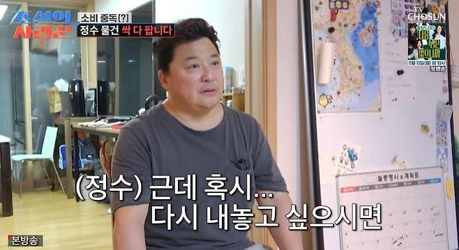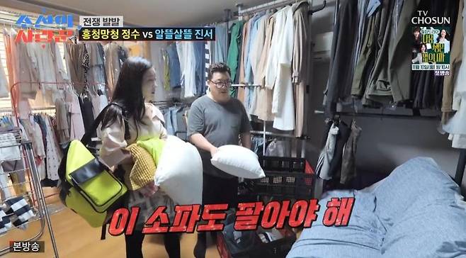 원진서는 물건들을 둘러보며 모두 팔아야 한다고 주장했지만, 윤정수는 "어딘가에서 쓸 수 있다" "이거 거의 새 거인데 아깝다"라며 미련을 버리지 못했다.