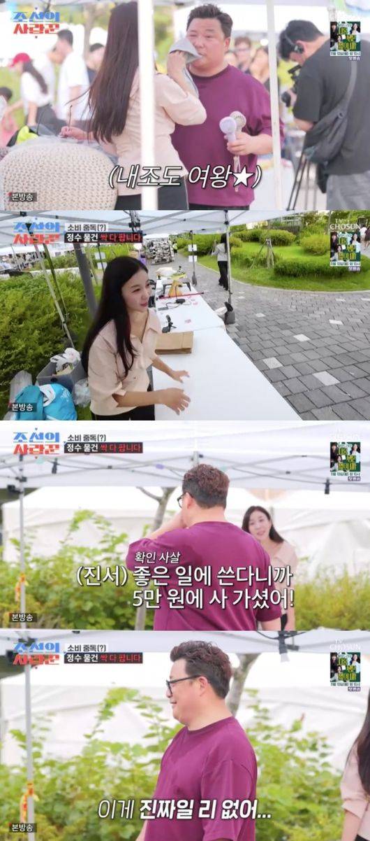 특히 원진서는 윤정수가 꽁꽁 숨겨둔 전동휠을 판매대에 올렸다. 윤정수가 없는 틈을 타 3만 원에 내놓았다. 현재 중고 시세로는 30~40만 원인 고가의 물건. 파격 할인가에 전동휠은 금방 판매되었다.