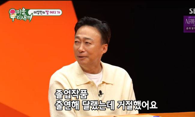 이성민은 "딸은 현재 연극영화과 제작전공 중"이라 말하면서 특히 "졸업작품 출연해달랬는데 거절했다"고 해 모두를 놀라게 했다.이에 신동엽은 "그래도 아빠 자랑스러워할 것"이라 하자 이성민은 "아무 생각없는 척해도 그런 것 같다 경상도 딸이다"고 했다.