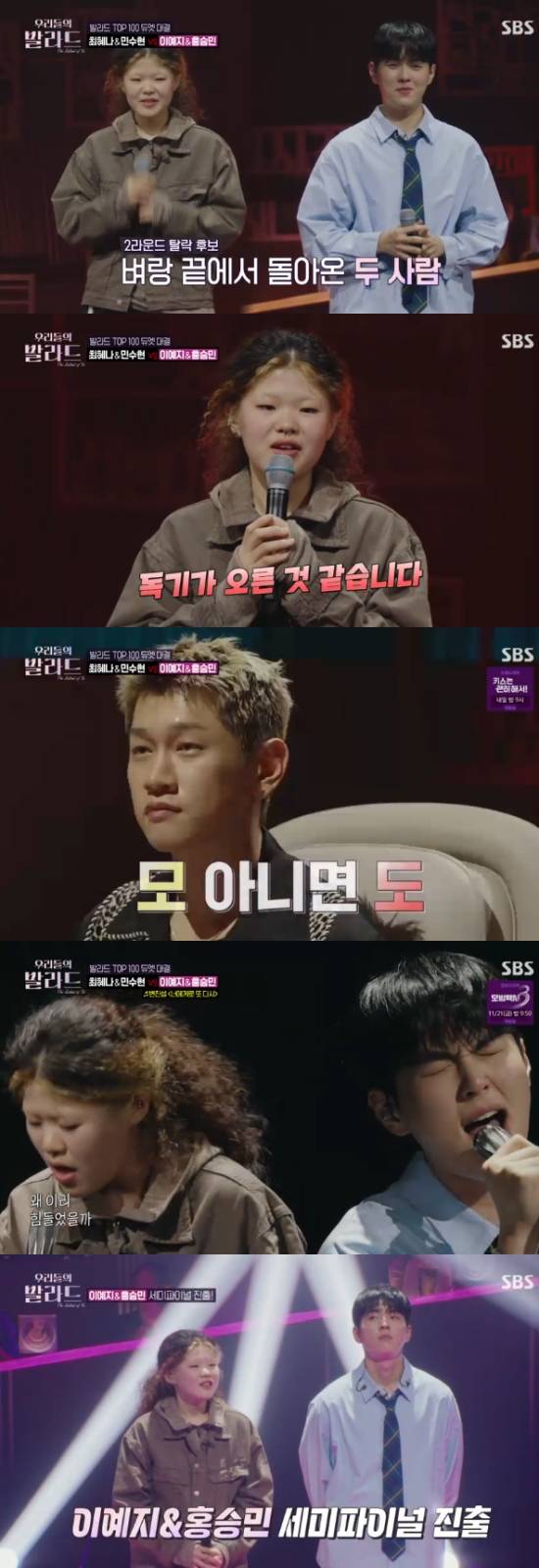 (엑스포츠뉴스 오수정 기자) '우리들의 발라드'에서 벼랑 끝에서 살아 돌아온 이예지와 홍승민이 독기를 품고 역대급 무대를 만들어냈다.