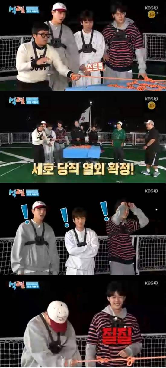 인간 제로 게임에서 김종민, 문세윤이 당직에서 면제된 가운데 매듭 복불복이 진행됐다. 4개의 매듭 중 2개는 당기면 풀리는 풀리면 당직 면제라고.