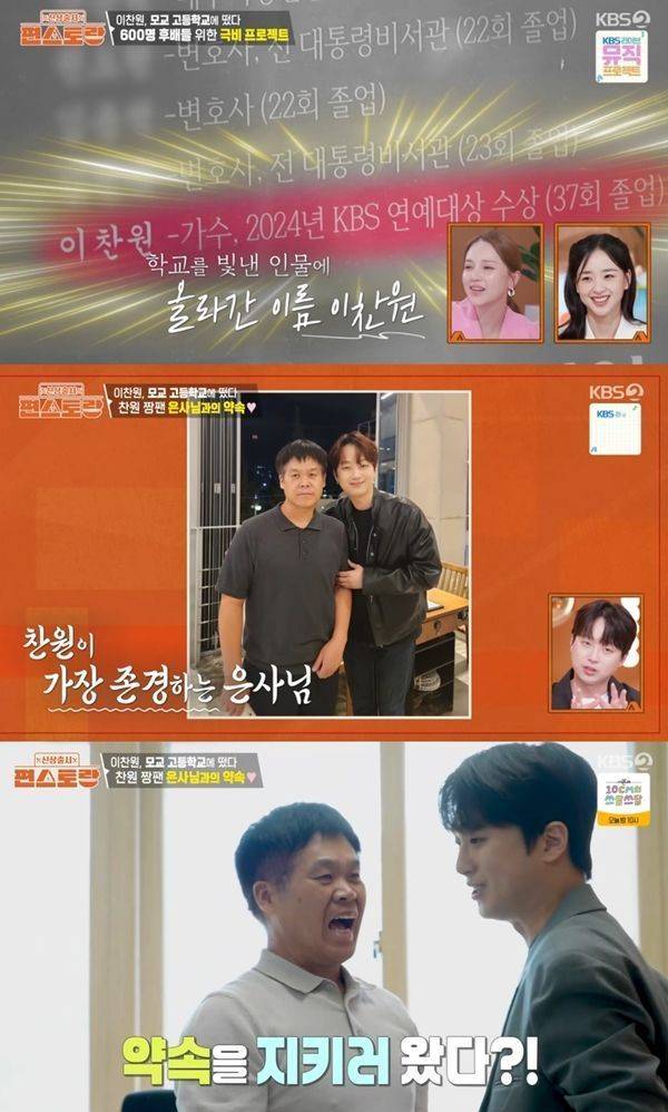 이찬원은 "약속 지키러 왔다"고 말했다. 앞서 '편스토랑'에도 출연했던 은사님에게 이찬원은 "편셰프 한번 학교로 가겠다"고 약속한 바 있다.