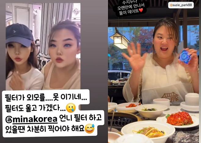 이후 미나 역시 "수지누나 오랜만에 만나서 둘이 데이트"라는 글과 함께 식사 현장을 공개하며 두 사람이 만났다는 사실을 알렸다.