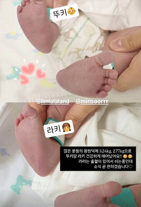 임라라와 손민수는 14일 부부 계정을 통해 “많은 분들의 응원 덕에 3.24kg, 2.77kg으로 뚜키랑 라키 건강하게 태어났어요!”라며 출산 소식을 전했다.