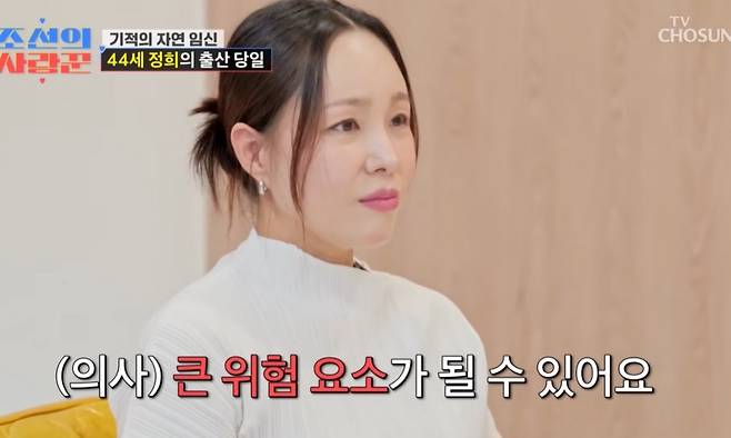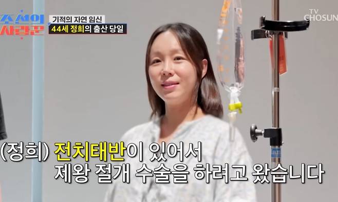 출산 당일 임정희는 "전치태반이 있어서 제왕 절개 수술을 하려고 왔다"고 말했다. 이어 "자궁 입구가 태반으로 막혀서 아이가 못 나오는 상황"이라며 수술 이유를 전했다. 출산 전 마지막 검진에서 의사는 임정희에게 "수술할 때 피가 많이 날 수 있다. 태반이 떨어지면 핏줄이 노출돼서 피가 솟는다"고 밝혔다. 덧붙여 "임정희 씨가 노산이어서 수술을 견디는 힘이 떨어질 것이다. 큰 위험요소가 될 수 있다"고 말했다. 임정희는 긴장하고 불안한 모습을 보였다.