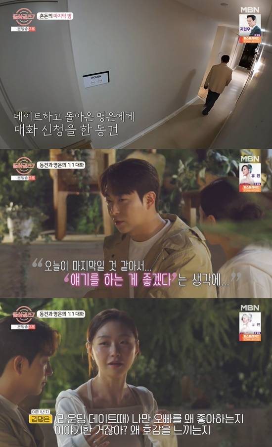하지만 동건은 명은에게 "오늘이 마지막일 것 같아서 얘기를 하는 게 좋겠다는 생각이 들었다"며 아름과 이야기를 끝낸 지 얼마 지나지 않아 명은에게 호감 표시를 전했다. 명은은 "오빠가 나의 미적지근한 반응에 나만 호감을 느끼는 줄 알았다"고 전하며 엇갈린 마음을 전했다.