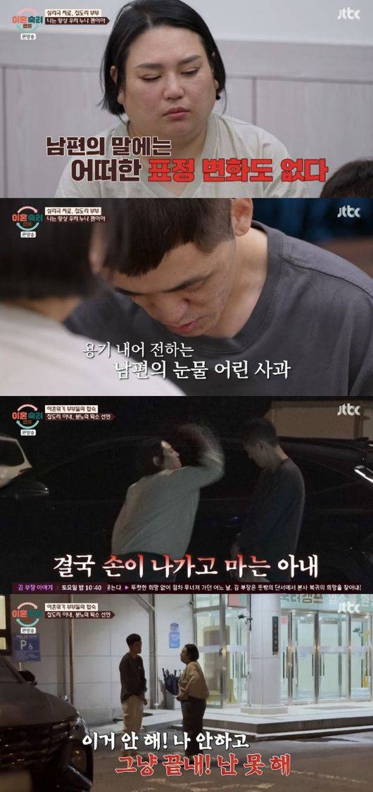 작가에게 토로하던 중 남편을 발견한 아내는 또 다시 욕설과 함께 분노를 터트렸다. 남편이 사과에도 결국 폭력을 휘둘렀고, 아내는 “뭘 고쳤냐. 몇 시간도 안 돼서 대화는 커녕 밖에 나가고”라고 소리쳤다.