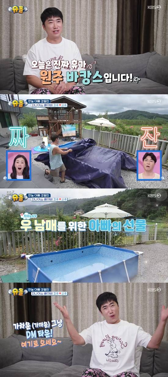 이날 방송에서 장동민은 "원주 바캉스를 즐길 생각이다"라고 밝혔다. 남매를 위해 장동민이 준비한 마당 수영장에 최지우는 "사이즈가 꽤 크다. 분위기 제대로다"라며 감탄했다. 안영미도 "키즈 펜션 스케일이다"라고 말했다.