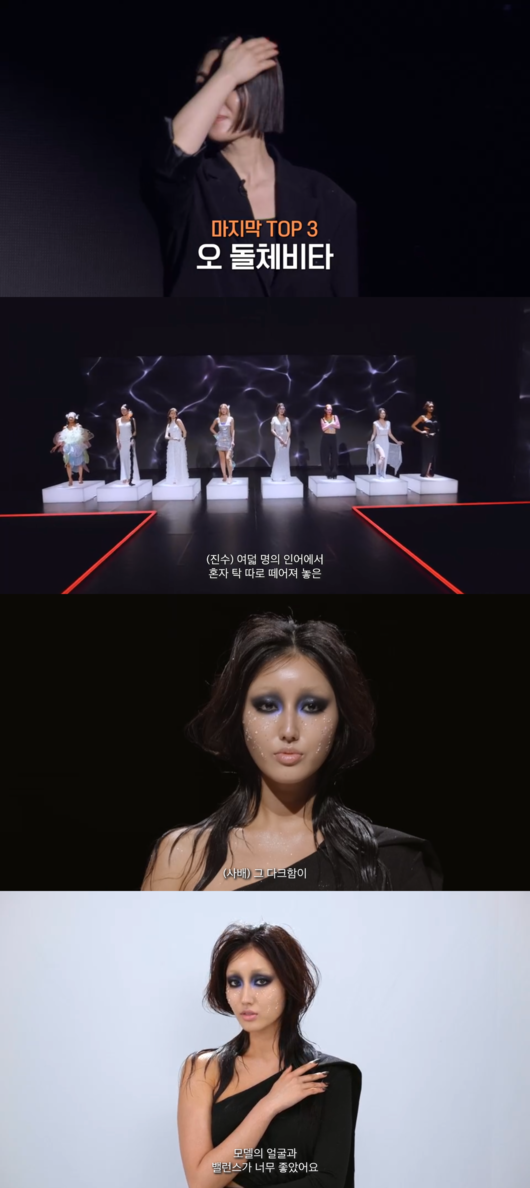 이사배는 “스킬적으로는 그냥 블랙 라인과 스모키가 아니다. 정교하다. 어느 하나 스머징 잘못 된 거 없고 완벽하게 구현됐다”고 했고, 서옥은 “아이라인 범위가 모델에 어울리는 정말 완벽한 비율의 영역을 딱 구현해냈고, 전체적인 메이크업이 모델의 얼굴과 밸런스가 너무 좋았다”고 말했다. 오 돌체비타는 “사실 기대 안 하고, 아까 그 인어가 마지막이 될 거고 마지막은 그래도 좀 가장 나다운 걸 보여드리고 싶다고 했는데, 알아주셔서 감사합니다”라고 TOP3 소감을 전했다.