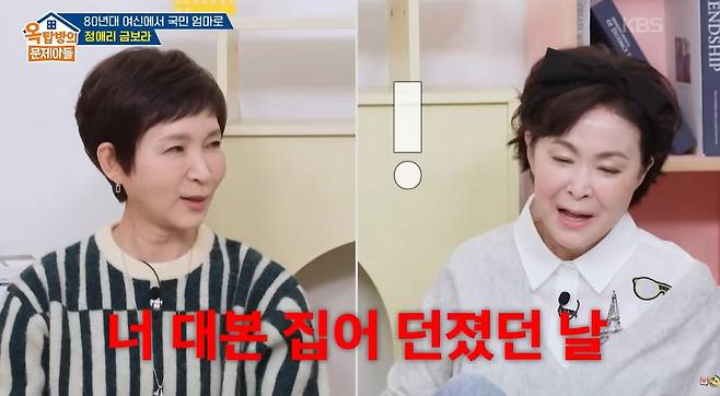 이어 정애리는 금보라와의 첫 만남을 떠올리며 "금보라가 대본을 집어던졌던 날이다"라고 밝혀 이목을 끌었다. 이에 금보라는 "함께 촬영하던 후배가 촬영을 자꾸 빠졌다. 상대 배역 없이는 촬영을 할 수 없는 상황이었다. 후배가 녹화 중 집까지 가서 다른 의상을 가져와야 하는 상황이 되니까 순간 '안 해 이 자식아'하고 대본을 던졌다"고 당시 상황을 설명했다.