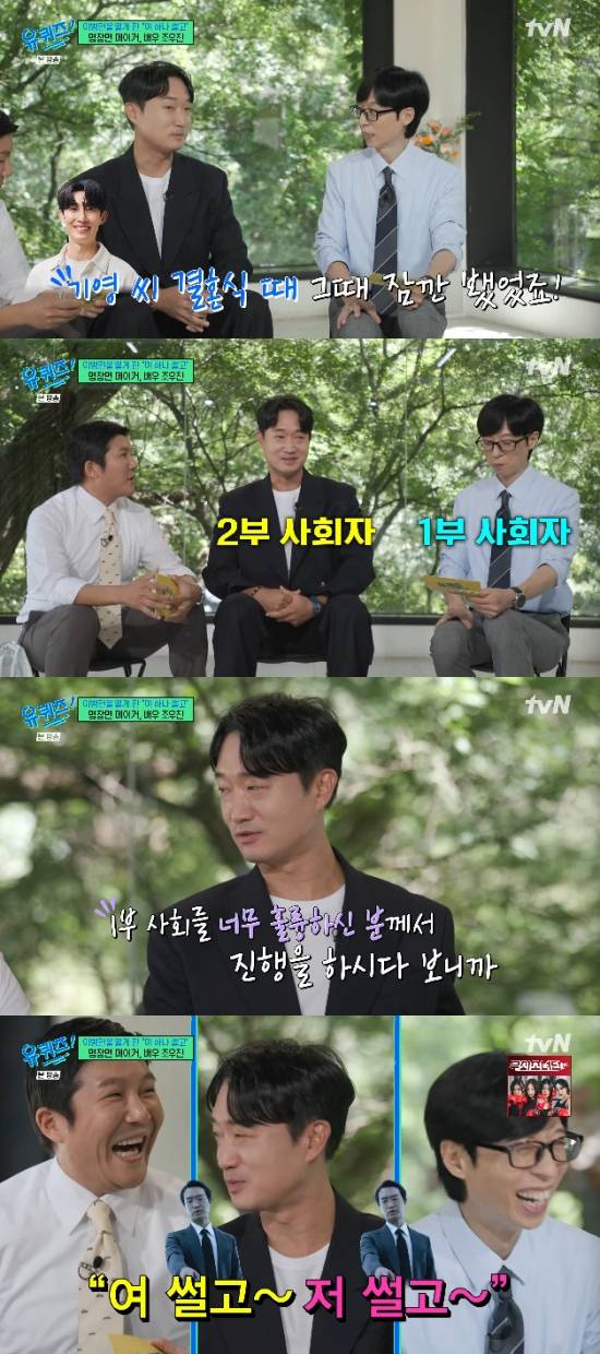 이날 방송에서 유재석은 조우진과 반갑게 인사를 하면서 "(강)기영 씨 결혼식 때 잠깐 뵀었다. 제가 1부 사회를 봤고, 우진 씨가 2부 사회자였다"고 했다.