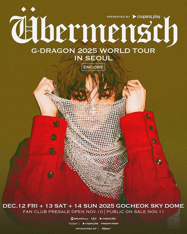 티켓팅은 11월 10일(월) 오후 8시 팬클럽 선예매, 11일(화) 오후 8시 일반 예매가 진행된다. ‘쿠팡플레이와 함께하는 G-DRAGON 2025 월드투어 ‘위버맨쉬’ 인 서울 앵콜’의 국내 티켓은 오직 쿠팡플레이 모바일 앱에서만 구매할 수 있다.