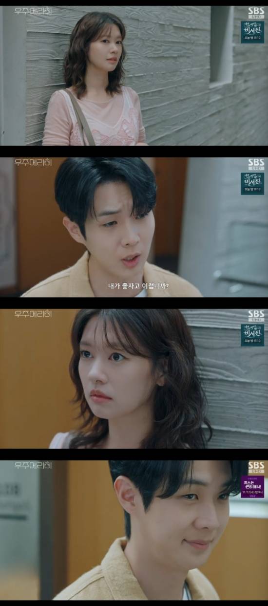 24일 방송된 SBS 금토드라마 '우주메리미' 5회에서는 백상현(배나라 분) 앞에서 신혼부부인 척 연기하는 김우주(최우식), 유메리(정소민)의 모습이 그려졌다.