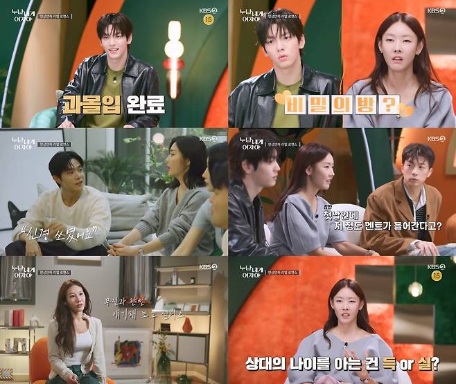 4명의 누나와 4명의 연하남 모두 서로의 얼굴을 확인하자, 박상원은 “누나 같지 않았다. 연상이라 해도 한두 살 이내에서 동년배 정도일 것 같다”고 첫인상을 전했다. 김무진도 “특별히 ‘누나다’ 그런 느낌은 없었다”고 말했고, 김현준도 “그렇게 크게 차이 난다고 느끼진 않았다”고 전했다. MC 수빈은 “나이가 아예 감이 안 온다”며 어리둥절한 표정을 지었다. 그러나 한혜진은 “최대 나이 차 띠동갑까지 있다”며 출연자들도 모르는 나이 차 때문에 벌어질 파장을 예고했다.