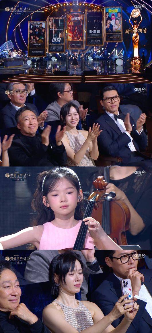 더욱이 이어 스태프들의 수상이 소개된 뒤 두 번째 축하 무대로 ‘어쩔수가없다’의 아역 최소율이 영화에서 등장했던 첼로곡 ‘가벼운 농담’을 현악 5중주 오케스트라로 선보이는 상황. 극 중 딸이었던 최소율의 등장에 손예진은 실제 자신의 핸드폰을 들어 영상을 찍었다. 여기에 현빈이 손예진 쪽으로 자연스럽게 몸을 기대며 진지하게 음악을 감상해 의미를 더했다.