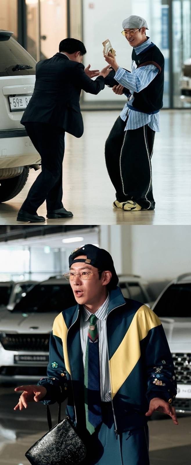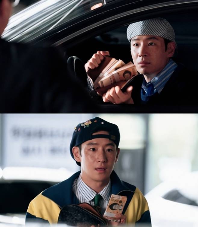 공개된 사진 속 김도기는 부티와 촌티가 공존하는 묘한 스타일링으로 시선을 강탈한다. 거꾸로 뒤집어쓴 헌팅캡에 순진무구한 표정, 손에 든 두툼한 돈다발까지 어우러져 짙은 '호구'의 향기를 풍긴다.