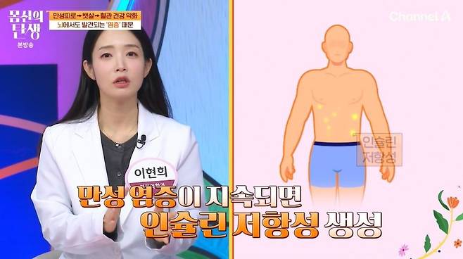전문의는 "몸에 미세한 염증이 계속 쌓이면 만성 염증이 인슐린 저항성을 만들어서 복부에 지방을 더 잘 쌓게 만드는 몸이 된다"라며 내방지방형 비만이 되기 쉽다고 했다. 또한 염증이 직접 혈관을 공격해서 혈관 질환을 유발하기도 한다고.
