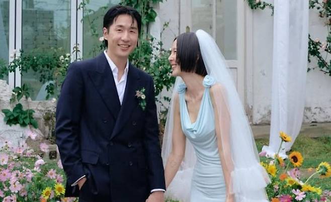 공개된 사진엔 김나영과 마이큐의 야외 결혼식 풍경이 담겼다. 사진 속 이들은 각각 턱시도와 순백의 웨딩드레스를 차려입고 선남선녀의 자태를 뽐냈다.