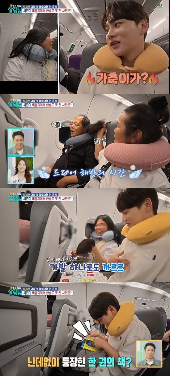 박서진은 부모님을 위한 음료수를 주문한다더니 갑자기 여행용 영어회화 책을 꺼냈다. 박서진 가족이 이번 여행을 위해 탄 비행기가 해외 국적기라 외국인 승무원만 있었던 것.