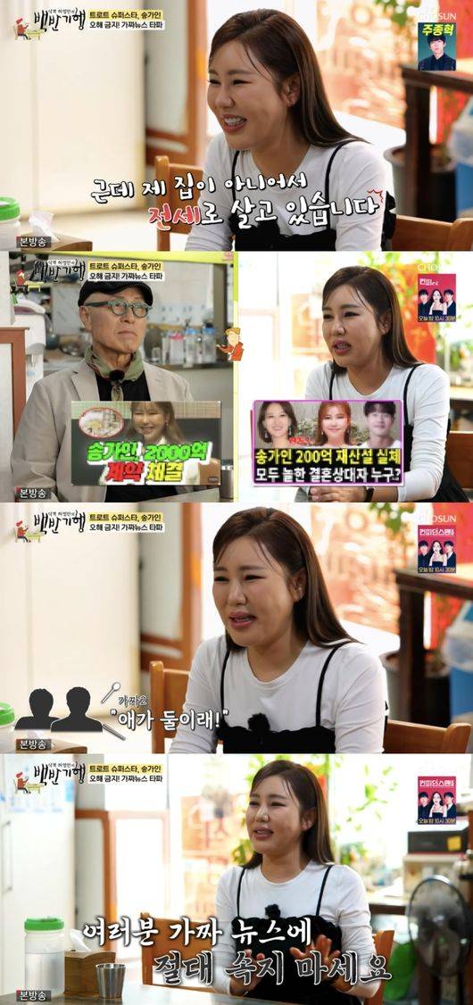 그러자 허영만은 “그만큼 여러 채 살 돈 벌었을 거 아니냐”라고 되물었다. 이에 송가인은 “사람들이 그렇게 생각하시는데 유튜브에 가짜 뉴스가 나온다. 저는 이미 건물을 산 사람이더라. 근데 그만큼 못 벌었다”라며 200억 재산설과 건물주에 대한 가짜뉴스에 대해 해명했다.