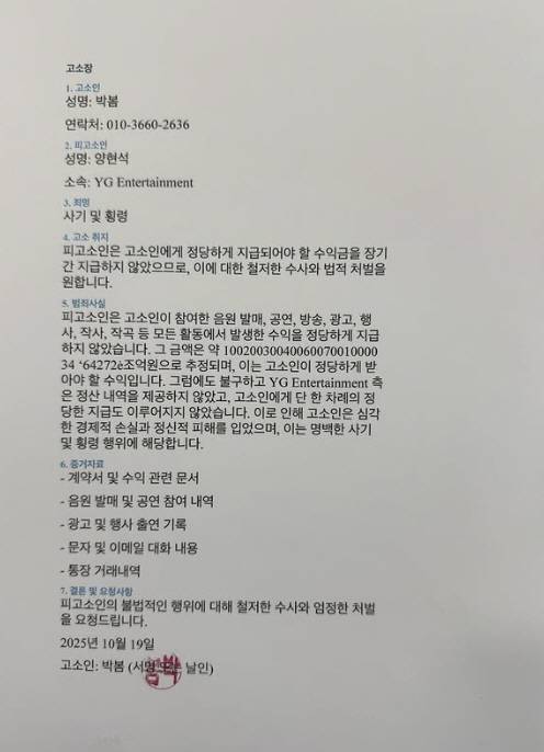 박봄은 "음원발매 공연 방송 광고 행사 작사 자곡 등 모든 활동에서 발생한 수익을 정당하게 지급하지 않았다. 그 금액은 1002003004006007001000034'64272e조원으로 추정된다. 그럼에도 YG 측은 정산 내역을 제공하지 않았고 고소인에게 단 한차례의 정당한 지급도 이뤄지지 않았다"며 경제적, 정신적 피해를 호소했다.