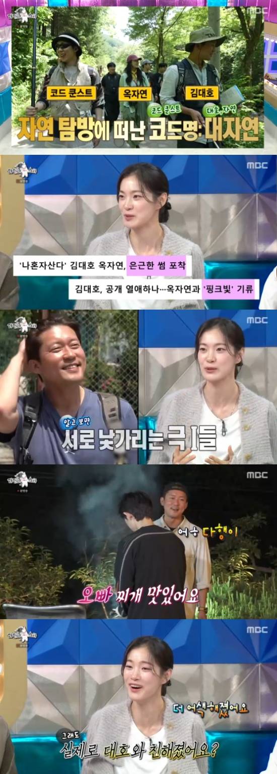 이에 봉태규는 "나도 궁금했다. 둘이 뭐가 있느냐"고 물었고, 옥자연은 "아니다. 김대호 님이랑 저랑 둘 다 낯을 가린다. 그래서 제가 프로그램을 위해 적극적으로 '오빠'라고 부르면서 방송을 했다"고 말했다.
