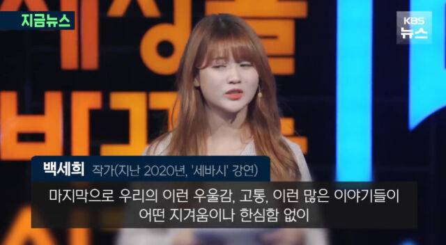한편, 백세희 작가는 지난 2020년 ‘세바시’ 강연에서 “마지막으로, 우리의 이런 우울감과 고통이 지겨움이나 한심함 없이, 또 쉽게 무뎌지거나 지워지지 않고 다양하게 말해질 수 있었으면 좋겠다”고 말한 바 있다.