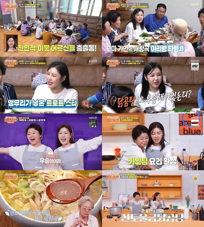 어르신들은 송가인에 대해 “어렸을 때부터 노래를 그렇게 잘했다”라며 “지금은 대한민국 1등 가수가 됐다”라고 뿌듯한 마음을 드러냈다. 그렇게 잔치를 즐긴 어르신들은 대결 메뉴로 닭곰탕을 선택했다.
