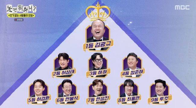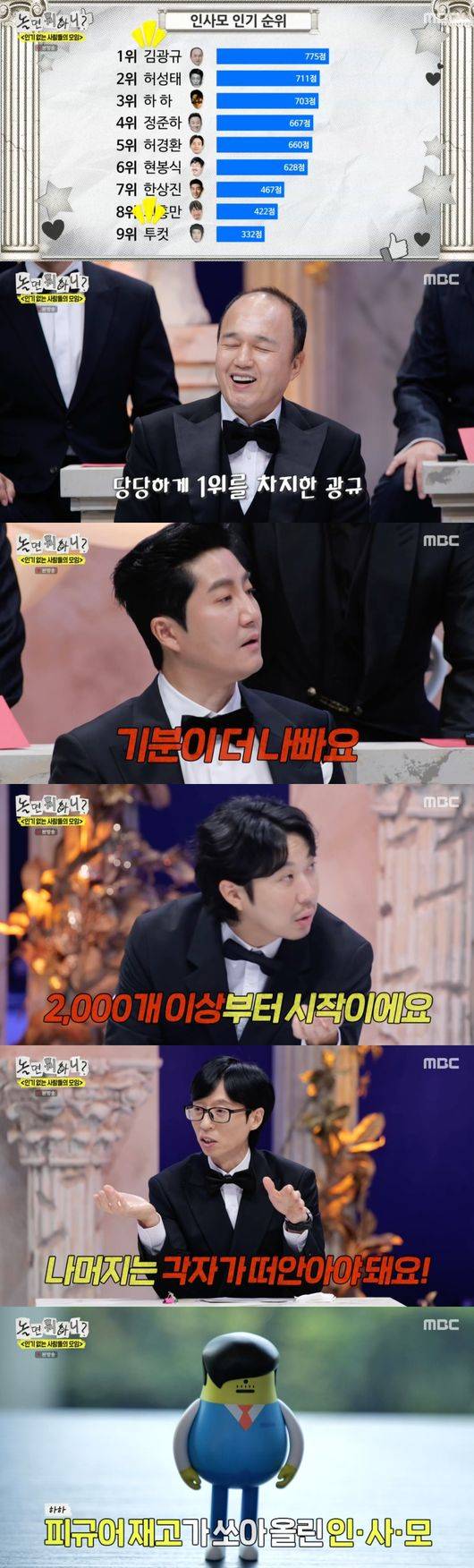 김광규는 첫 투표 1위의 소감에 대해 "학교 다닐 때 1등 한 번도 못해봤는데 기분이 너무 좋다. 올림픽으로 따지면 금메달 아니냐. 금 한 돈 달라"라고 말했다가 분위기를 싸하게 만들며 웃음을 더했고, 투컷은 "전에 녹화 끝나고 하하형이 전화가 왔다. 재미로 얘기한 거니 마음에 담아두지 말라고. 그 얘기 들었을 때보다 기분이 더 나쁘다"라고 말해 주위를 폭소케 했다.