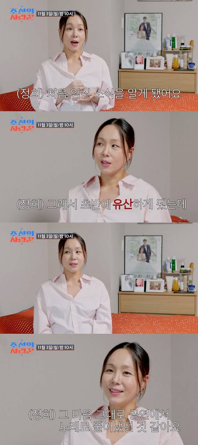 11월 3일(월) 방송될 ‘조선의 사랑꾼’ 선공개 영상에서 임정희는 “결혼하고 두 달 정도 됐을 때 처음 임신 소식을 알게 됐다”며 이야기를 시작했다. 그는 “그때는 준비가 안 되어 있어서 못 느꼈던 것 같다. 초반에 유산하게 됐는데, 그때 공연을 하고 있어서 알고도 병원에서 수술을 못하고 공연에 나섰다”면서 결혼 초, 갑작스럽게 알게 된 임신과 돌연 아이를 잃게 된 유산의 아픔을 담담하게 털어놓았다.