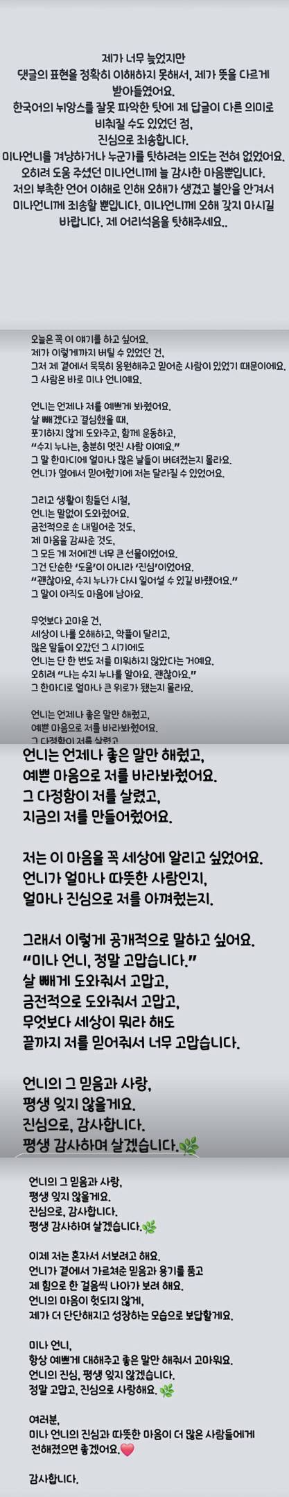 수지는 "저의 부족한 언어 이해로 오해가 생겼고 불안을 안겨 미나언니께 죄송할 뿐이다. 미나 언니께 오해 갖지 말아달라. 제 어리석음을 탓해 달라. 언니는 언제나 저를 예쁘게 봐줬다. 언니가 믿어줬기에 저는 달라질 수 있었다. 생활이 힘들던 시절 언니는 말없이 도와줬다. 금전적으로 손 내밀어준 것도 제 마음을 감싸준 것도 모든 게 너무 큰 선물이었다"고 전했다.