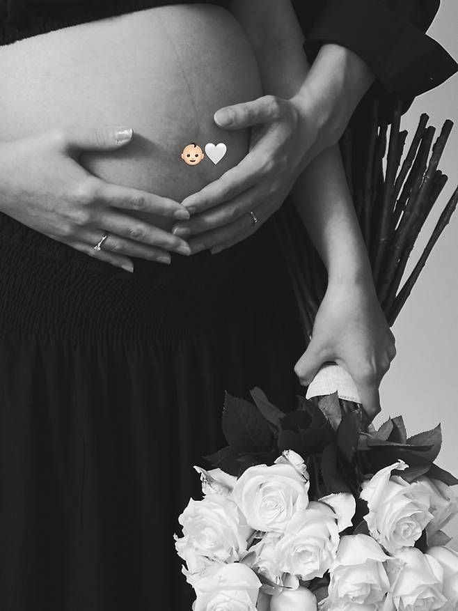 흑백으로 처리된 사진에는 유나의 만삭의 배를 남편이 함께 감싸 안고 있는 모습이 담겼다. 배 부분에는 아기 얼굴과 하트 모양의 이모티콘이 더해져 곧 태어날 아이에 대한 애정을 엿볼 수 있다.