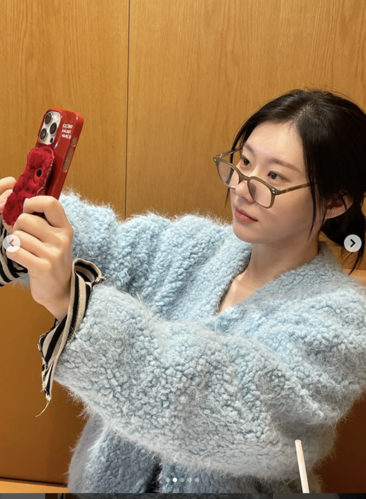 특히 뿔테 안경을 쓰고 휴대폰 카메라를 향헤 셀카 찍는 포즈를 취한 사진이 눈길을 끈다. 폭신한 니트 질감과 빨간색 폰케이스가 어우러져 채령 특유의 통통 튀는 매력을 한층 배가시킨다. 꾸밈없이 편안한 분위기 속에서도 세련된 감각이 묻어나는 ‘꾸안꾸’ 겨울 패션의 정석을 보여줬다.