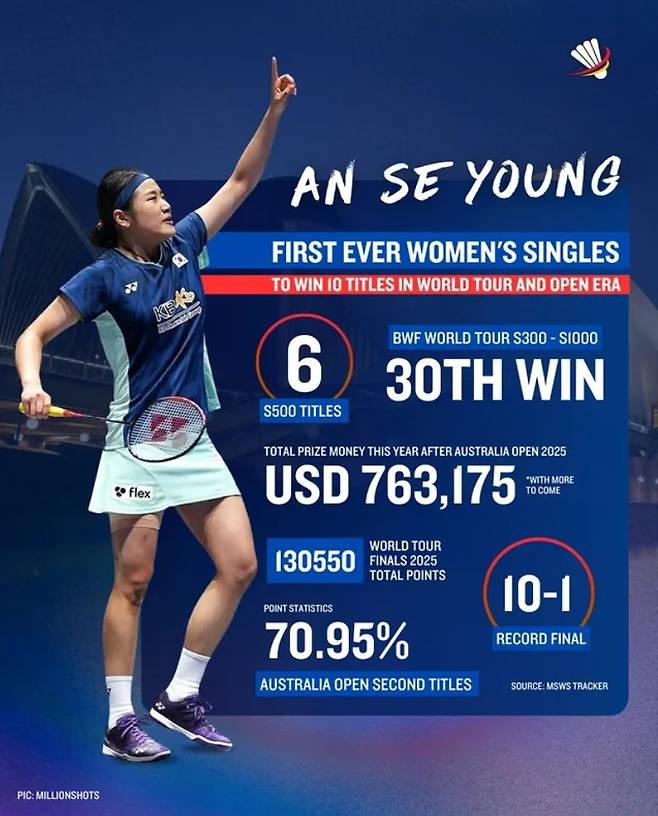 호주 오픈 우승으로 안세영은 이번 시즌 10관왕을 달성했다.