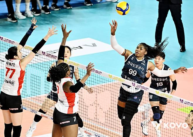 경북 김천체육관에서 펼쳐진 여자부 경기에서는 한국도로공사가 페퍼저축은행을 3-0(25-18 25-19 25-19)로 완파했다.