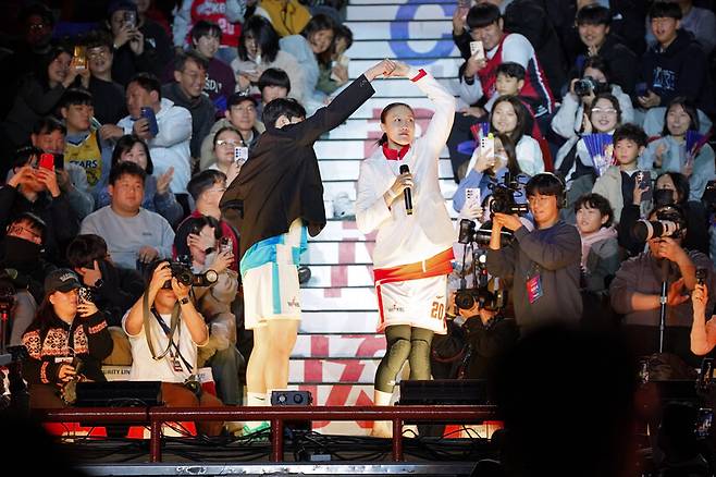 BNK의 이소희와 박정은 감독은 ‘괜찮아 딩딩딩딩’ 퍼포먼스를 함께 만들었다. 삼성생명의 하상윤 감독과 이해란, 신한은행의 최윤아 감독과 신이슬 역시 감독과 함께 춤을 추며 귀여운 장면을 연출했다. 감독과 선수의 경계는 이 순간만큼은 사라졌다.