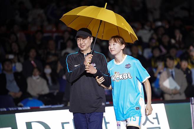 KB스타즈의 이채은과 김완수 감독은 노란 우산 퍼포먼스를 선보였다. 이채은이 직접 우산을 씌워주는 설정이었다. 우리은행의 이명관과 위성우 감독은 헤드셋을 씌워주는 장면으로 큰 웃음을 안겼다. 이명관의 심쿵한 표정과 놀란 연기(?)가 압권이었다. 영화 ‘라붐’을 떠올리게 하는 연기였다.