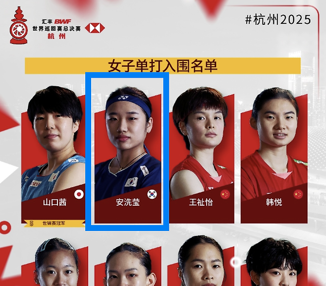 그럼에도 야마구치가 지난 8월 프랑스 파리에서 열린 2025 세계배드민턴선수권대회 챔피언에 오른 것이 포스터 맨 앞을 차지한 이유인 것으로 보인다. 세계 챔피언인 세계랭킹이 8위밖으로 밀려도 월드투어 파이널에 무조건 초대받는다.