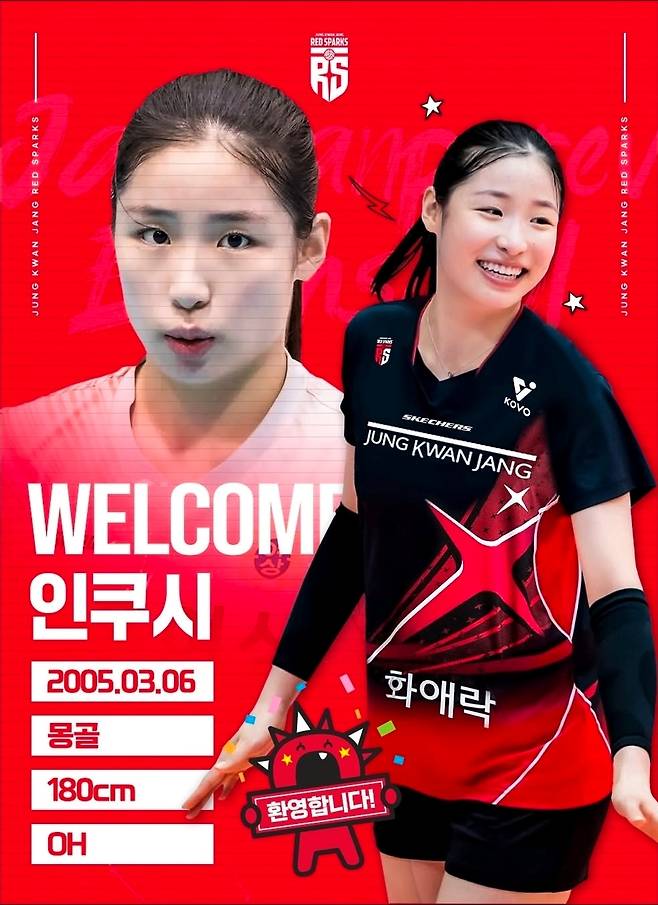 2005년생인 인쿠시는 몽골 프리미어리그 다르한 모글스에서 활약 중이었다. 지난 4월 한국배구연맹(KOVO) 아시아쿼터 드래프트에 도전했으나 지명을 받지 못했다. 정관장은 "인쿠시는 180cm의 신장으로 점프 타이밍이 빠르고 폭발력이 돋보이는 선수"라고 설명했다.