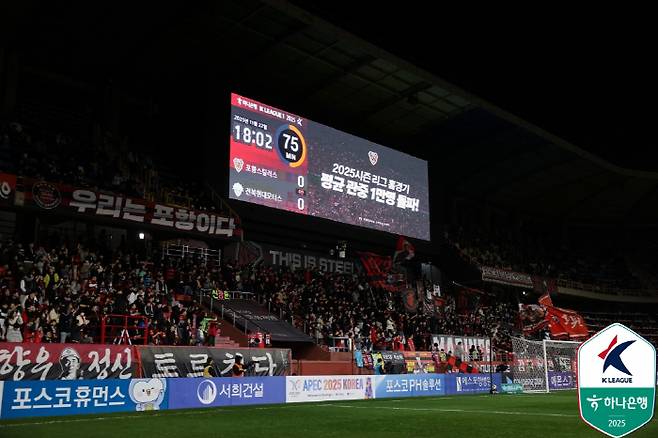올 시즌 포항은 또 하나의 지표를 세웠다. 2025시즌 홈경기 평균 관중 1만명(1만248명)을 달성했다. 총 좌석수의 71.8%에 해당하는 높은 수치다. 2018년 K리그가 유료 관중 집계를 시작한 이후 구단 역사상 처음으로 달성한 대기록이다. 포항의 여건을 고려하면 더 의미가 깊다. 포항시 인구는 2025년 10월 기준 48만8953명이다. 소도시라는 한계를 극복하고, 인구 대비 높은 관중 비율을 자랑했다. '축구도시 포항'이라는 평가가 어색하지 않은 성과다.
