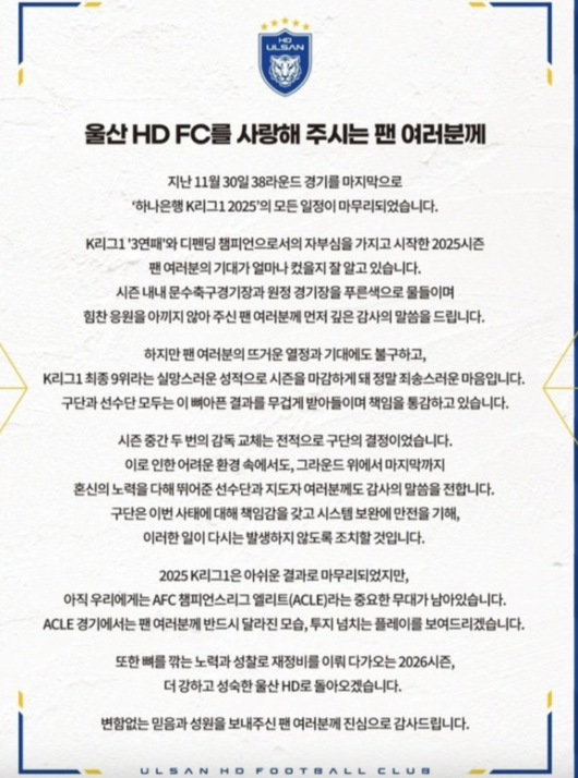 울산은 16일 "지난 5일 대한축구협회로부터 수신한 '울산 HD 선수단 및 前감독 관련 논란에 대한 사실관계 확인 요청의 건' 공문에 대해 15일 회신을 완료했다”며 내용을 공개했다.