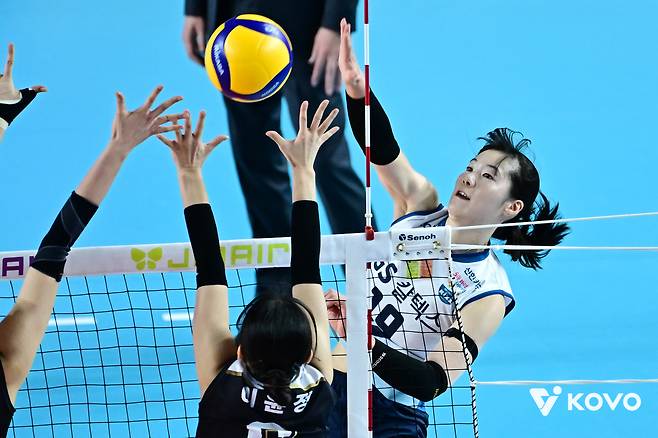 [장충=남정훈 기자] GS칼텍스와 IBK기업은행의 2025~2026 V리그 여자부 4라운드 맞대결이 펼쳐진 15일 서울 장충체육관. 이날 경기 전까지 IBK기업은행이 승점 32(10승11패)로 4위, GS칼텍스가 승점 30(10승11패)로 5위로 중위권 싸움을 치열하게 전개 중이다. 전날 3위 흥국생명(승점 39, 12승10패)이 선두 도로공사를 3-1로 꺾고 승점 3을 챙기면서 두 팀의 사정은 더욱 급해졌다. 흥국생명 추격을 위해서 반드시 서로를 이겨야 하는 ‘승점 6’ 짜리 매치업이 성사된 셈이다.