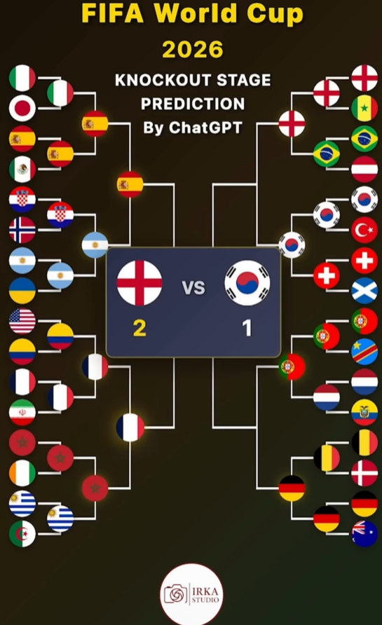 챗GPT가 예상한 북중미 월드컵 토너먼트 대진표에서 한국은 32강전에서 튀르키예를 2-1로 꺾은 뒤, 16강에서 스위스도 2-1로 제압하면서 8강에 오를 것으로 예상했다. 8강에선 '축구 종가' 잉글랜드를 만나 1-2로 패해 준결승 진출이 좌절될 것으로 내다봤다.