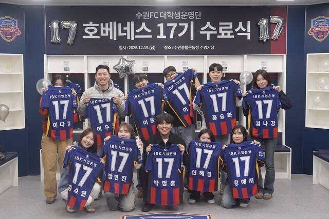 수원 FC 대학생운영단 <호베네스> 17기 단원들이 지난 12월 19일 오후 5시 수원 FC 사무국에서 진행된 수료식을 끝으로 활동을 마쳤다. 호베네스 17기는 2025년 1월 모집을 시작해 2월 최종 선발됐으며, 홈경기 운영팀과 미디어팀 두 개 팀으로 구성돼 한 시즌 동안 구단과 함께 했다.